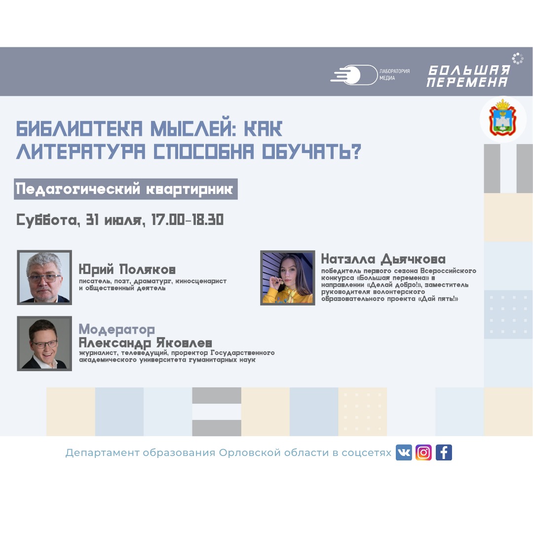 Ссылка на «Педагогический квартирник»: https://bolshayaperemena.team/streamer/1407